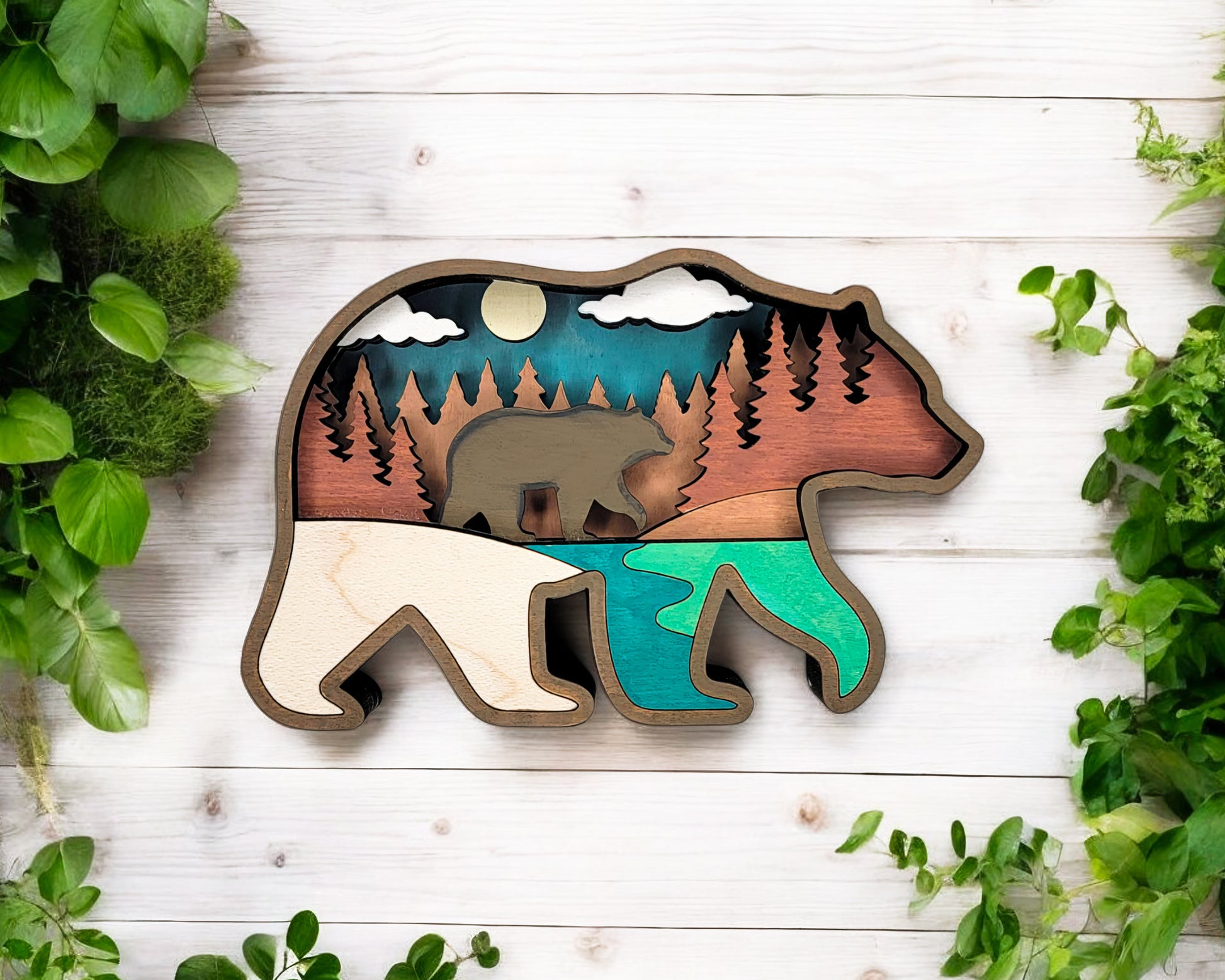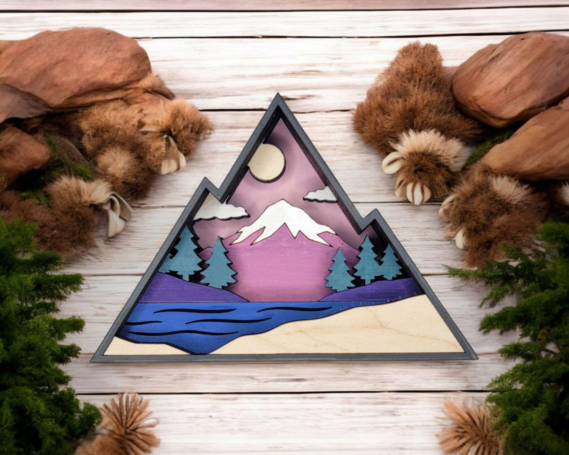 A natural fit for any outdoor, camping, or adventure-themed gift shop. The Layered Outdoor Collection features beloved icons of the outdoors — Deer, Compass, Bass Fish, Bear, RV Trailer, and Fish Hook — each rendered in four laser-cut Baltic birch layers with vibrant painted skies, mountains, lakes, and sunsets for a striking 3D effect.
